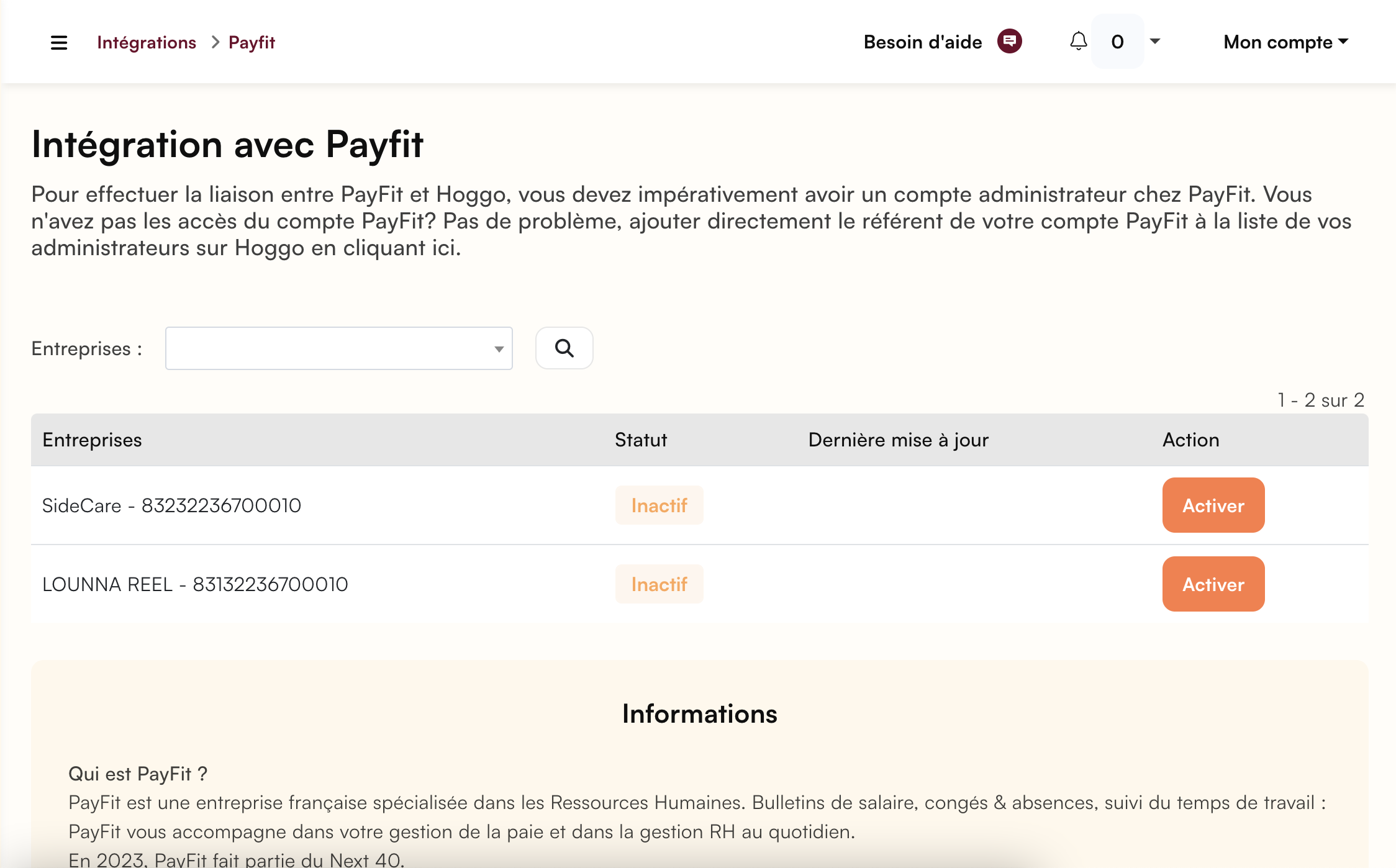 2 Sélectionnez PayFit et cliquez sur le bouton Activer